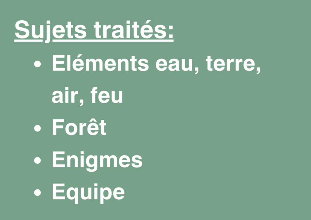 An dëser Formatioun léiers du eis Aktivitéit iwwer d’4 Elementer kennen, bei där eng Klass eng Dageschallenge zu de 4 Elementer am Bësch léise muss. Du léiers déi verschidde Rätsel an Aufgabe kennen a wéi s du de Grupp duerch dës Dageschallenge leeds.